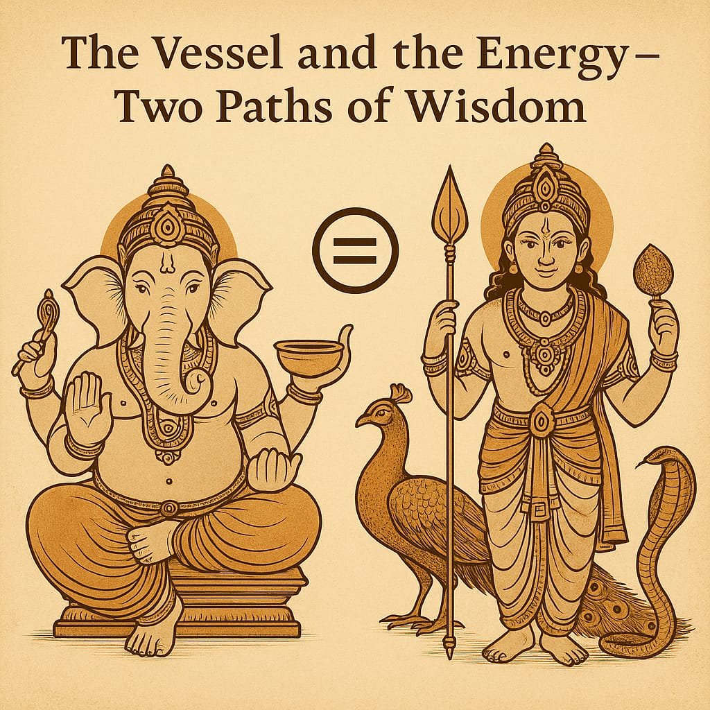 Murugan’s wisdom is the ripened fruit — ready to be shared but never forced. Ganesh’s wisdom is the vessel — ready to hold and protect that fruit so it can be preserved and passed on.