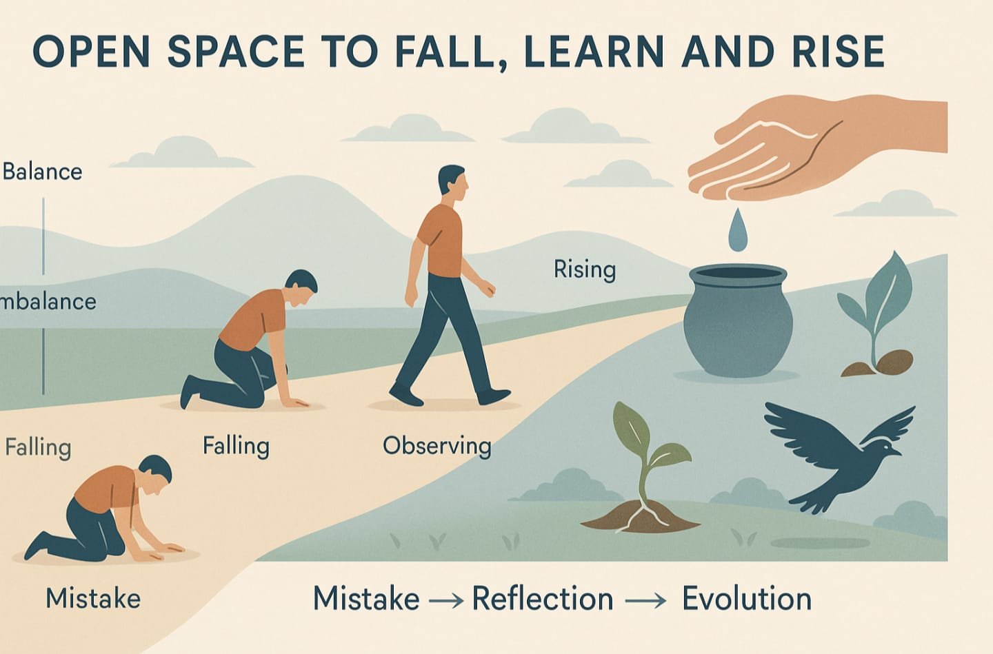 Nature allows mistakes freely — a cub falls many times before running, a bird flaps and tumbles before flying, even a seed must break its own shell to rise. There is no shame, no judgement, no punishment from nature. Mistake is not crime there — it is education.